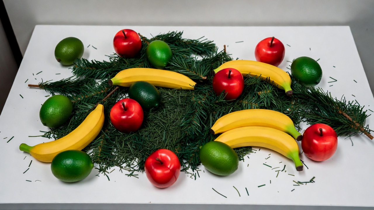 A white table displays clusters of yellow bananas, red apples, and green limes arranged among green fir branches. The fruits are realistically textured and brightly colored, scattered naturally across the surface. No people or additional objects are present.