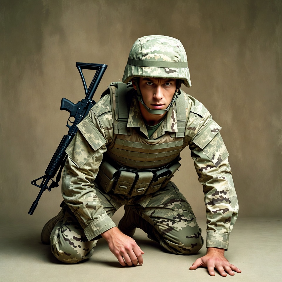 M4 carbine, White, armed soldier, army, beige background, camo pants, camouflage, combat gear, helmet, infantry, kneeling, male, man, military, rifle, serious expression, tactical vest, uniform, weapon, soldier