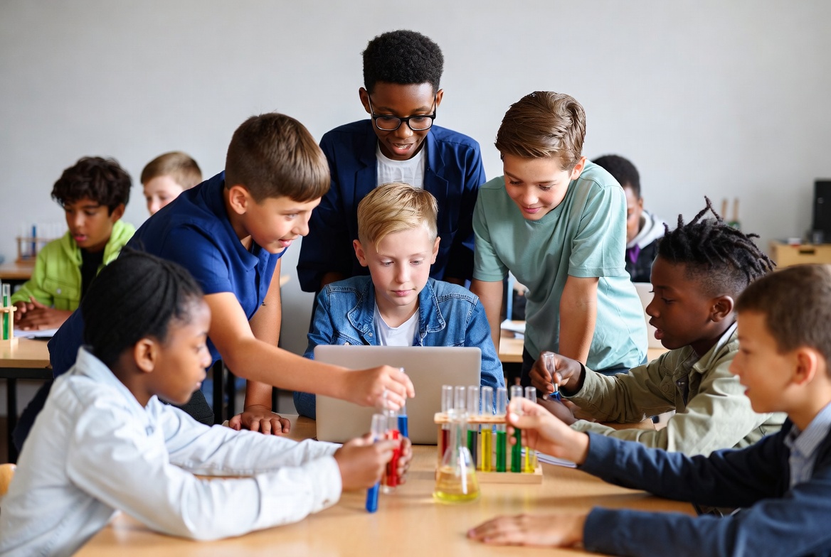 African-American, Multiracial, STEM, White, beakers, boys, classroom, collaboration, colorful liquids, diverse, education, experiment, flasks, focused, girls, group work, kids, laptop, learning, school, science experiment, table, teamwork, test tubes, young students, children