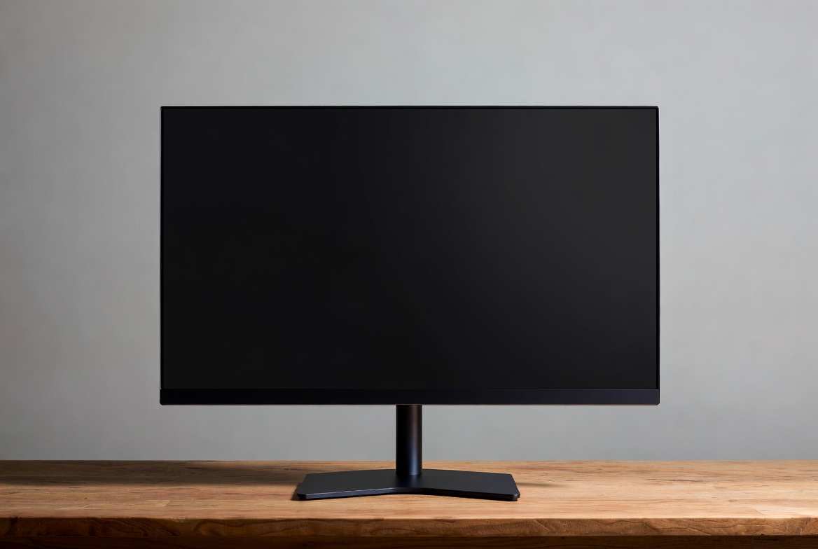LCD monitor, PC monitor, black monitor, dark screen, desk, display, isolated background, monitor screen, office equipment, stand, technology, thin bezel, wooden desk, computer monitor
