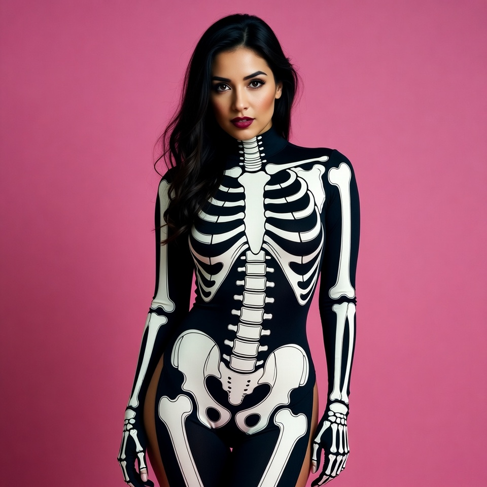 A beautiful woman with long dark hair poses confidently in a tight black bodysuit painted with white skeleton bones. She wears a high collar and full gloves matching the costume, standing against a vibrant pink background. Her makeup features deep maroon lips and striking eyes.
