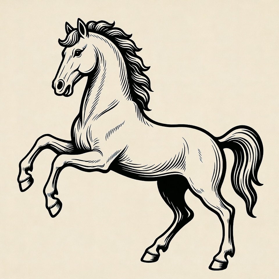 animal, black and white, clipart, engraving style, hooves, illustration, isolated background, line art, mane, rearing horse, stallion, tail, vector art, vintage illustration, horse