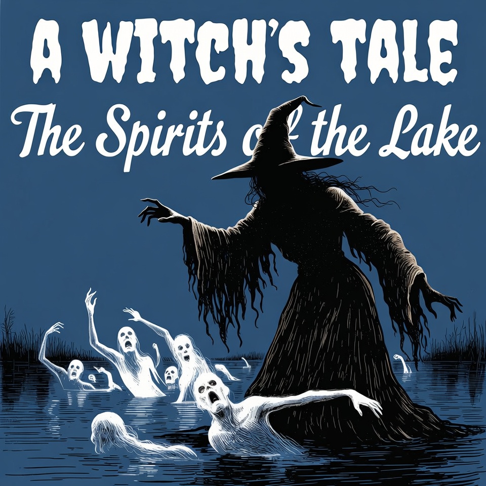 Halloween, blue background, dark art, eerie, emerging ghosts, fantasy, ghosts, horror, illustration, ink drawing, lake, night scene, pointed hat, raised arms, reeds, spirits, spooky, summoning, supernatural, tattered dress, title text, translucent figures, water, witch's tale, witch