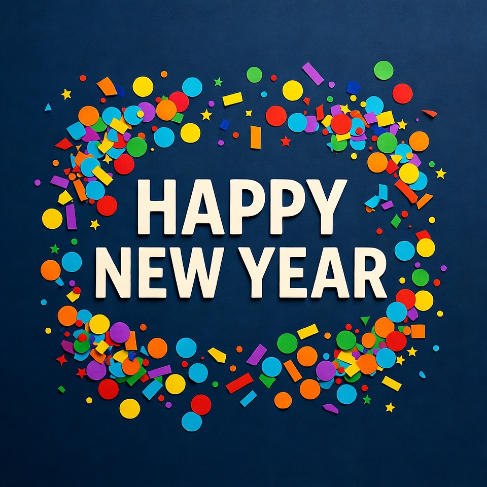 Colorful confetti shapes including circles, stars, and squares surround the words 'HAPPY NEW YEAR' cut from white paper. The vibrant red, yellow, blue, and multicolored pieces are arranged on a solid dark blue background. The festive design features scattered geometric elements forming a frame around the bold text.