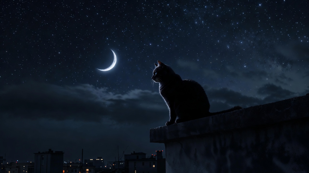 A silhouette of a black cat sits on a rooftop edge at night. A crescent moon glows in the starry sky above scattered clouds. City lights twinkle faintly in the distant background.