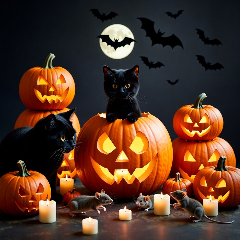 Multiple carved jack-o-lantern pumpkins with glowing faces surround three black cats and several small rats on a dark surface. Bats fly against a black night sky with a full moon in the background. Candles illuminate the Halloween-themed arrangement.