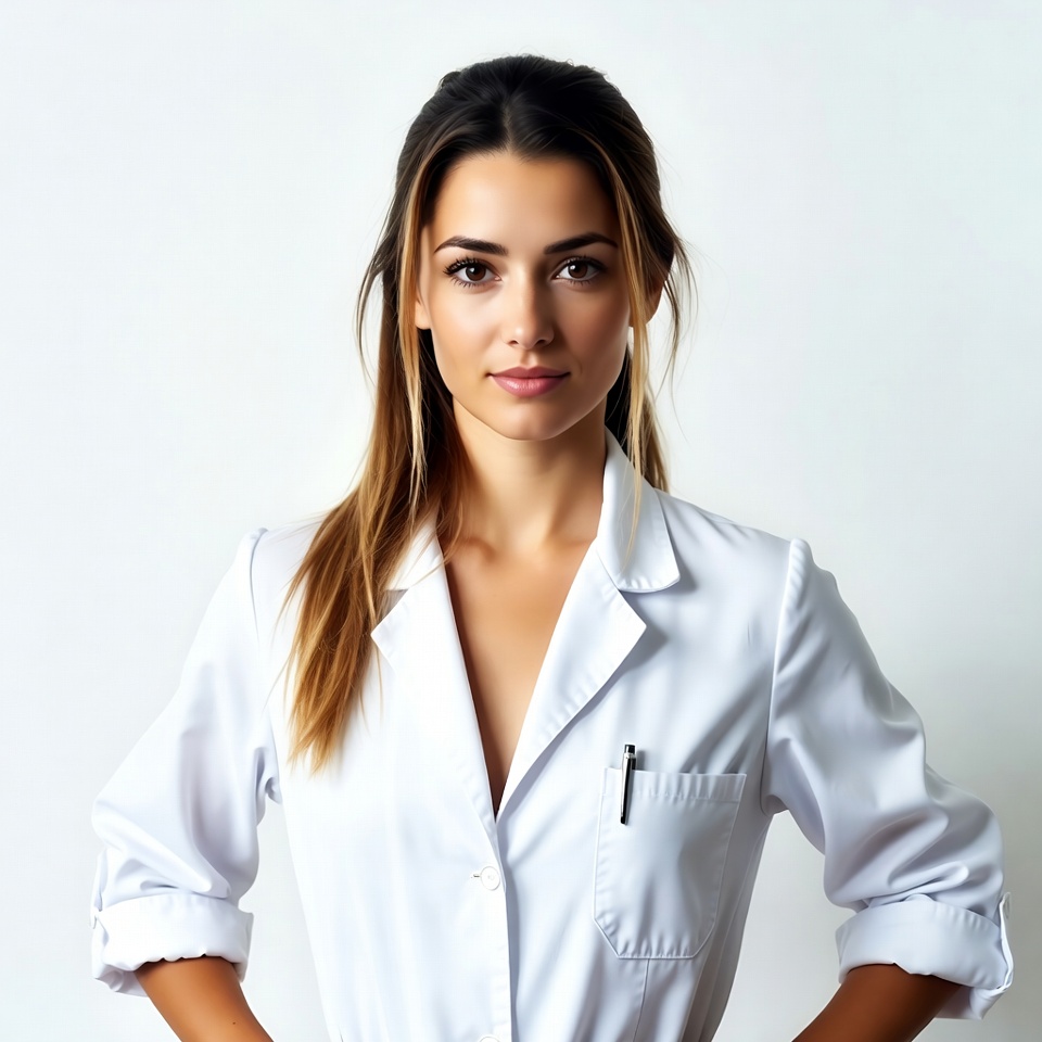 A young woman with long wavy brown hair stands confidently against a white background wearing an open white lab coat. She has a subtle smile, light makeup, and a pen tucked into her coat pocket. Her ponytail is loosely tied back.