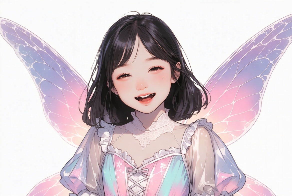 A smiling Asian girl with short black hair and large purple fairy wings stands against a white background. She wears a frilly pastel dress with lace collar and corset details in shades of blue, pink, and white. Her eyes are crinkled in joy, and the image is a detailed digital illustration.