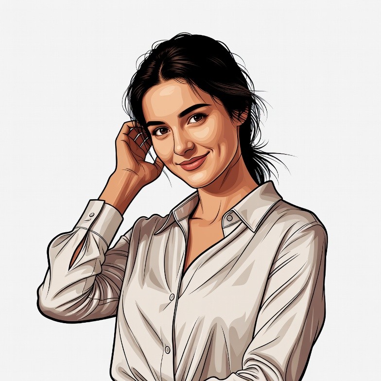 A digital illustration of a young woman with long dark brown hair tied in a ponytail smiles gently while touching her hair with her right hand. She wears a white collared shirt with rolled-up sleeves and stands against a plain white background. Her expression is warm and approachable with subtle makeup.