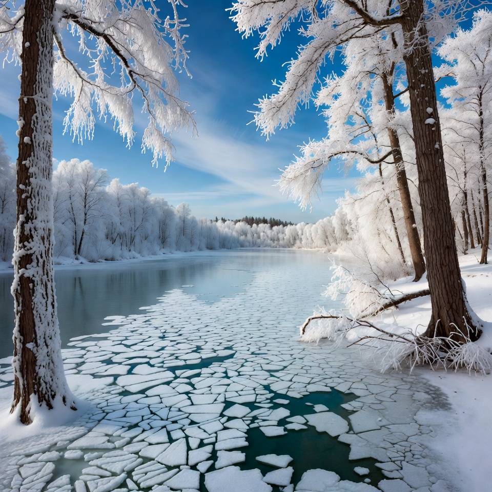 Tall trees covered in white frost frame a serene frozen river with cracked blue ice. Snow blankets the ground and branches under a clear blue sky with scattered clouds. A dense forest of frosted trees extends into the background.
