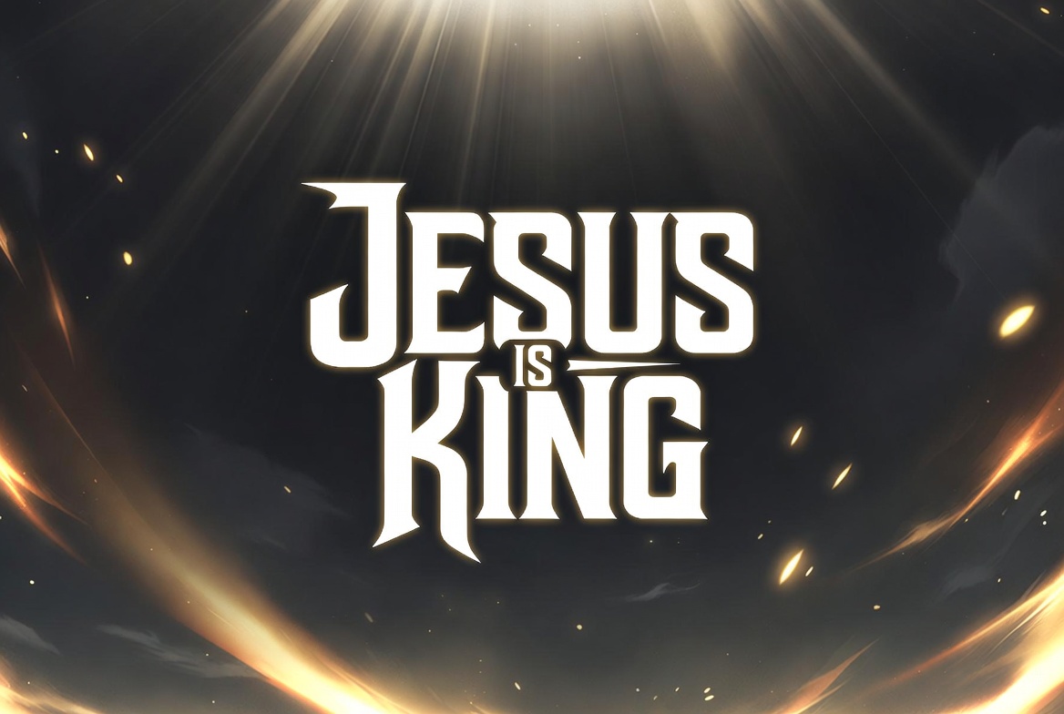 Christian graphic, Jesus King, King, bold font, dark background, dramatic lighting, faith design, fire glow, flames, glowing text, golden rays, metallic text, religious text, spotlight effect, worship graphic, Jesus