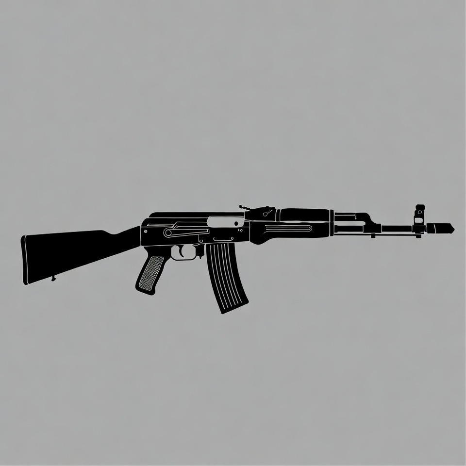 A black silhouette illustration of an AK-47 assault rifle on a solid gray background. The rifle features a curved magazine, wooden stock, and distinctive barrel design. It is depicted in a side profile view with clean, sharp outlines.