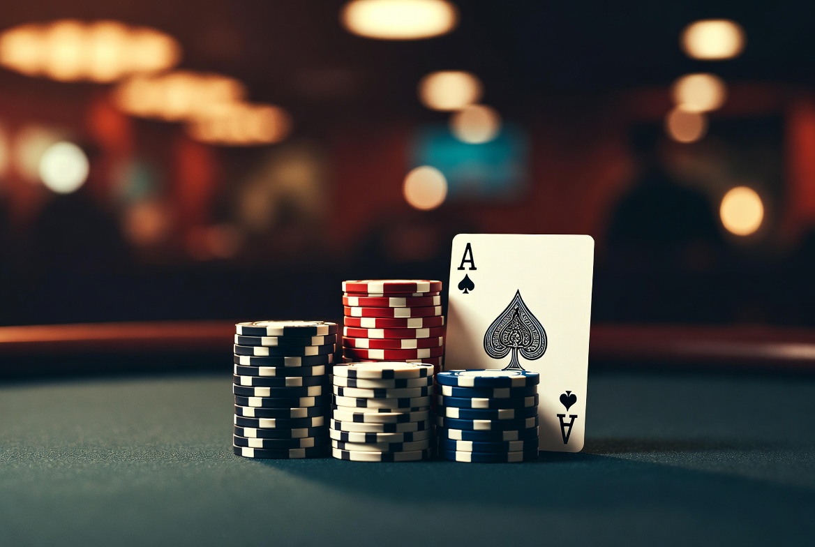 A white Ace of Spades playing card sits prominently on a green poker table surrounded by stacks of black, red, and blue poker chips. The background features a blurred casino interior with warm lighting and bokeh effects. The composition highlights the card and chips in sharp focus against the out-of-focus gaming environment.