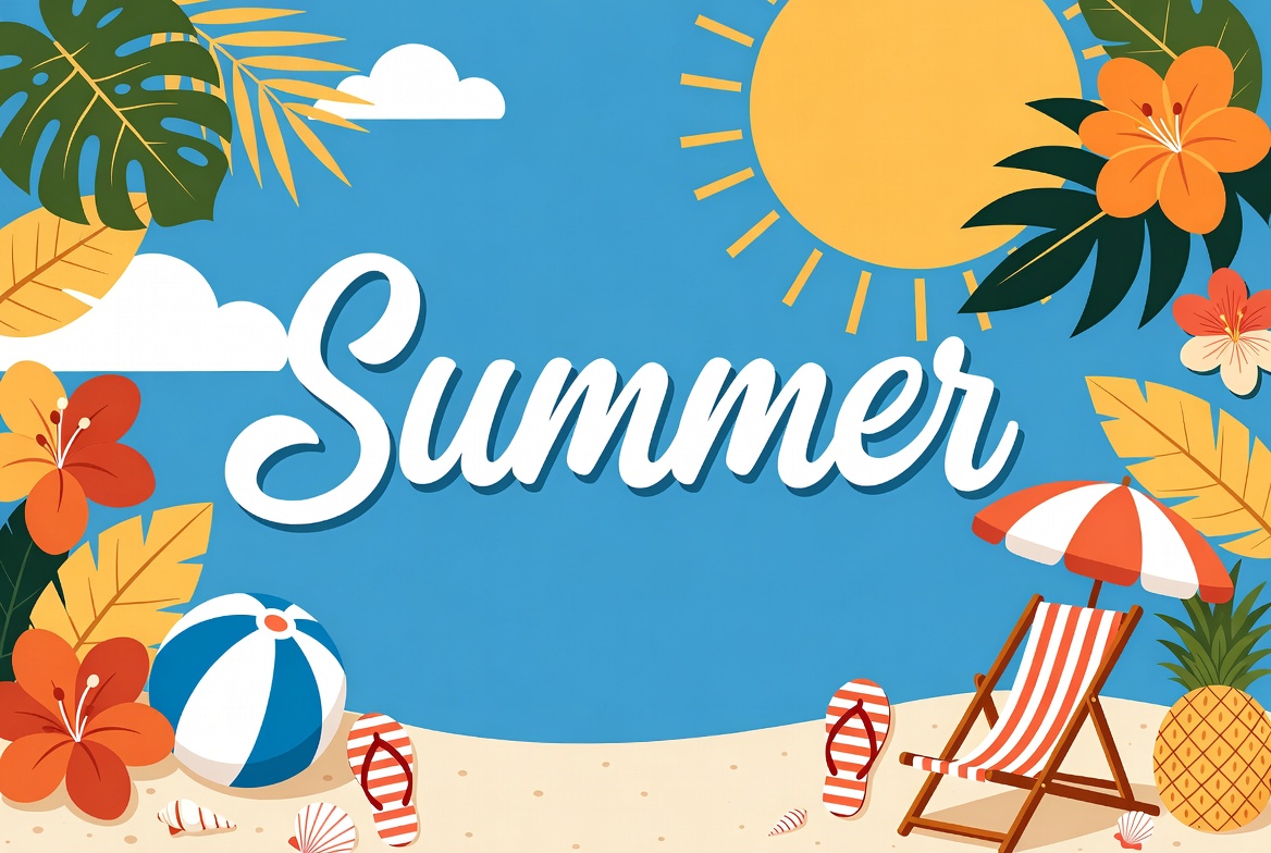 A vibrant illustration features the word 'Summer' in white cursive letters on a blue sky background with a yellow sun and white clouds. Tropical elements include palm leaves, hibiscus flowers, a beach chair, striped umbrella, beach ball, flip-flops, pineapple, and seashells on sandy ground. The scene evokes a tropical beach paradise with colorful vector graphics.