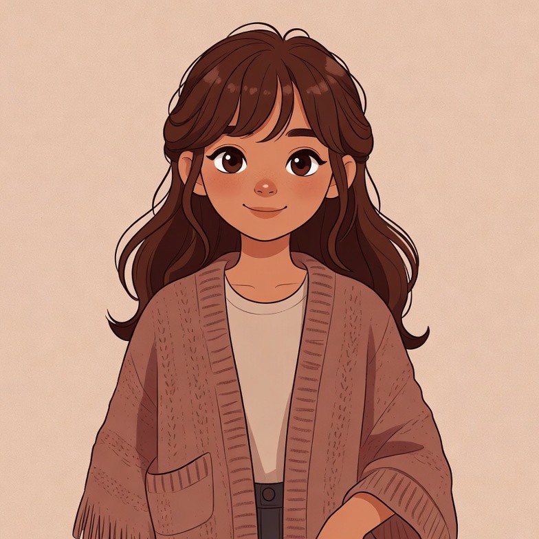 A cute illustrated Asian girl with long brown hair smiles warmly at the viewer. She wears a beige open cardigan over a white t-shirt and stands against a plain background. Her large expressive eyes and soft features give her a friendly appearance.