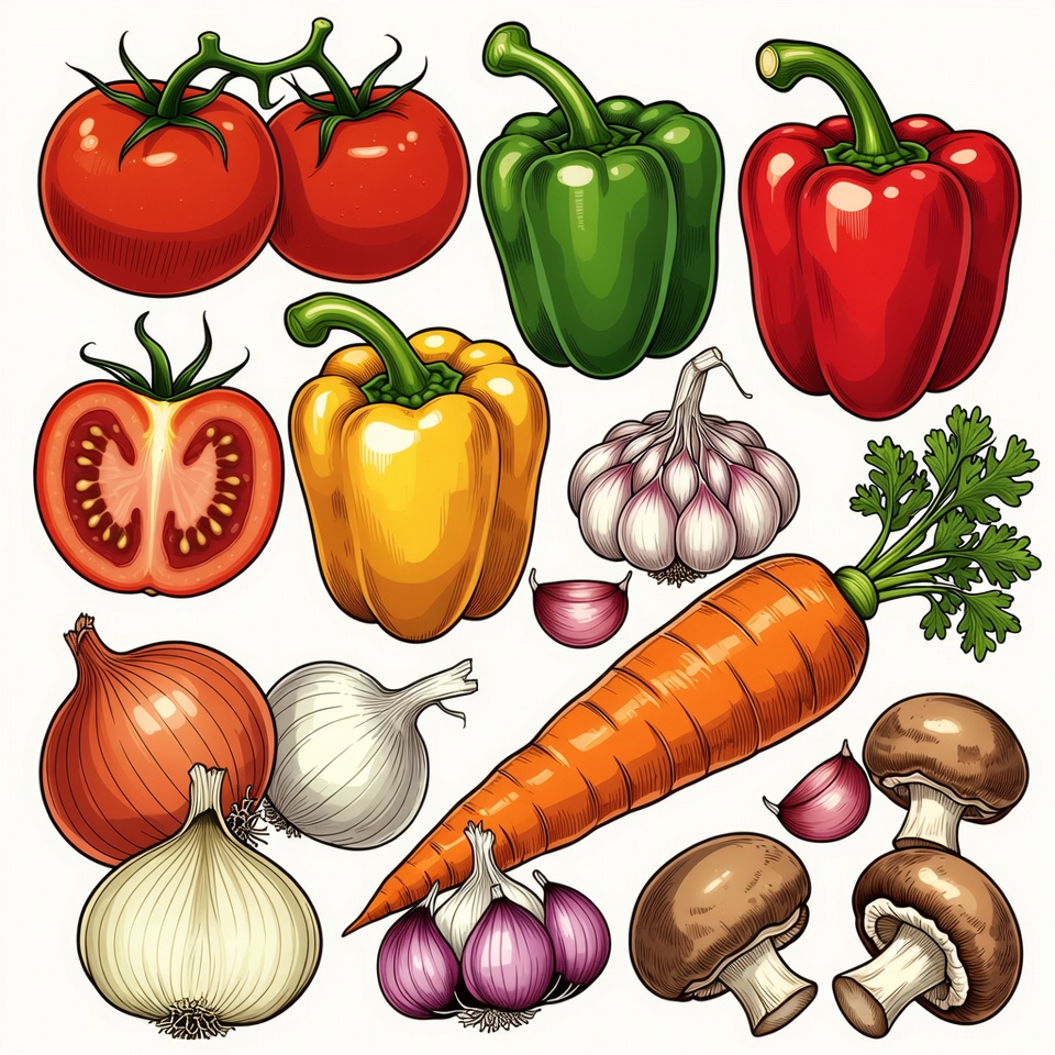 A vibrant illustration features various fresh vegetables on a white background. It includes red tomatoes sliced open, green red and yellow bell peppers, orange carrots, white and purple onions, garlic bulbs, mushrooms, and cilantro sprigs. All vegetables are depicted in detailed, colorful line art style.