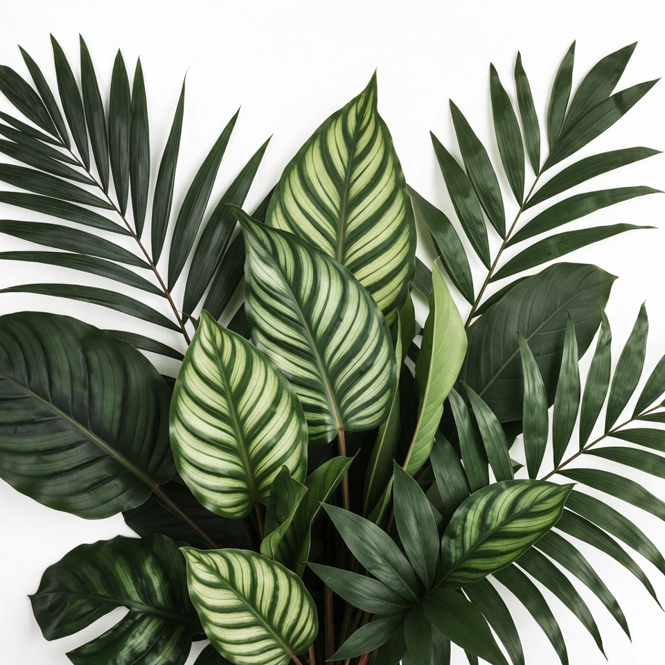 botanical, calathea, exotic plants, foliage, fresh plants, green foliage, green leaves, houseplants, indoor plants, isolated background, leaf arrangement, lush greenery, nature, palm fronds, plant cluster, plants, striped leaves, variegated leaves, white backdrop, white background, tropical plants