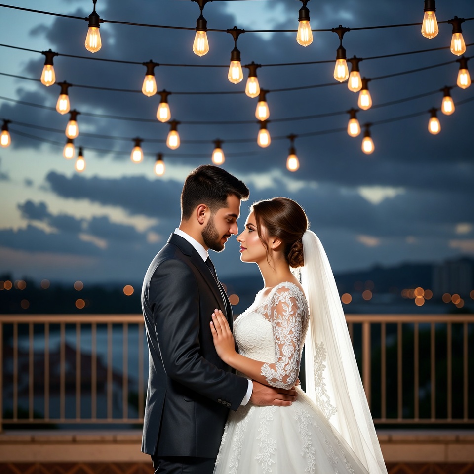 A Middle Eastern groom in a dark suit tenderly embraces his bride in a white lace wedding gown with a veil on an outdoor balcony. Warm string lights hang overhead against a twilight sky with city lights in the background. The couple gazes closely at each other in an intimate moment.