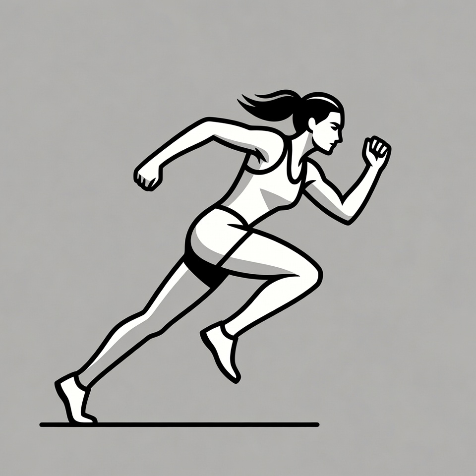 A black and white line art illustration depicts a woman running dynamically with her hair in a ponytail. She wears a tank top, shorts, and sneakers, captured mid-stride on a gray background. Her muscular arms and legs are emphasized in the minimalist vector style.
