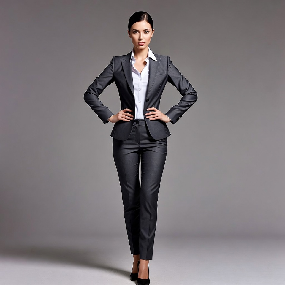 A young Asian woman with dark hair in a bun stands confidently with hands on hips. She wears a tailored gray blazer, white collared shirt, gray trousers, and black high heels. The image features a plain gray background.