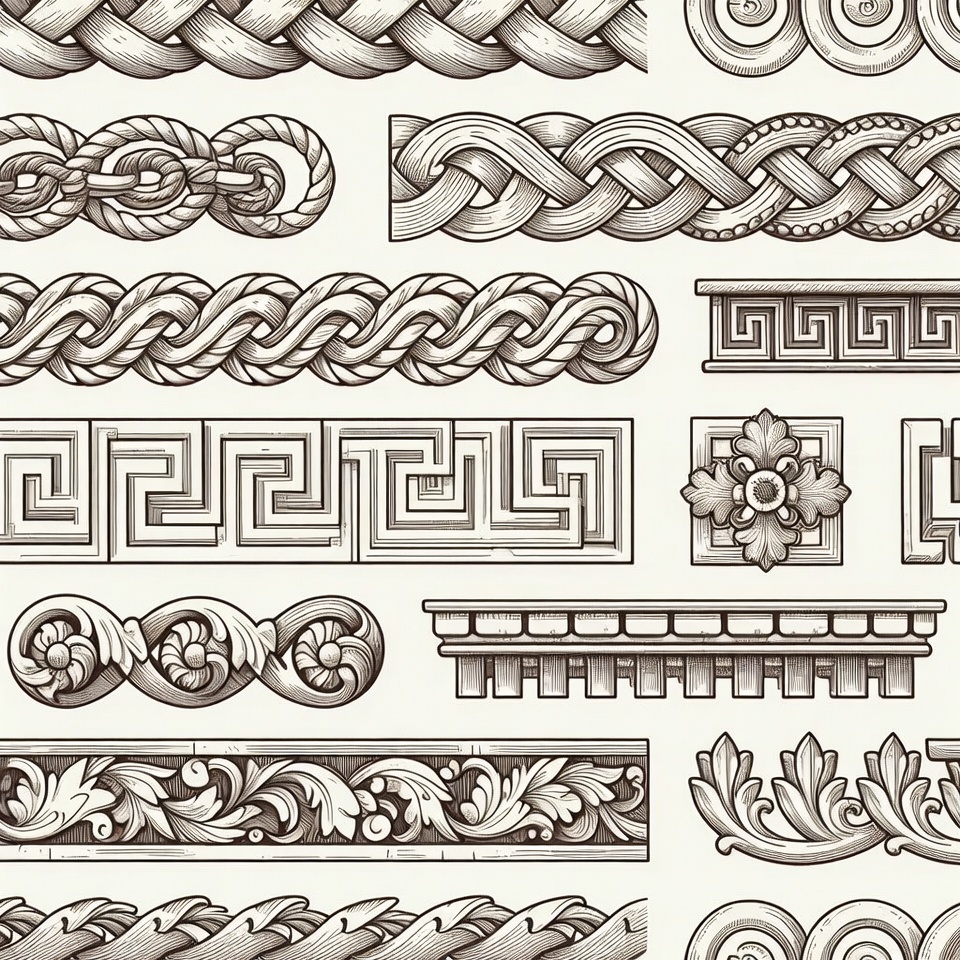 Greek key, architectural trim, baroque ornament, black white, braided borders, classical design, clipart borders, decorative motifs, engraving style, floral ornaments, foliage motif, heraldry style, interlaced knots, isolated background, line art, meander pattern, neoclassical border, ornate elements, pattern collection, rope twist, scroll design, symmetrical art, vector graphics, vintage borders, wave pattern, Celtic knots