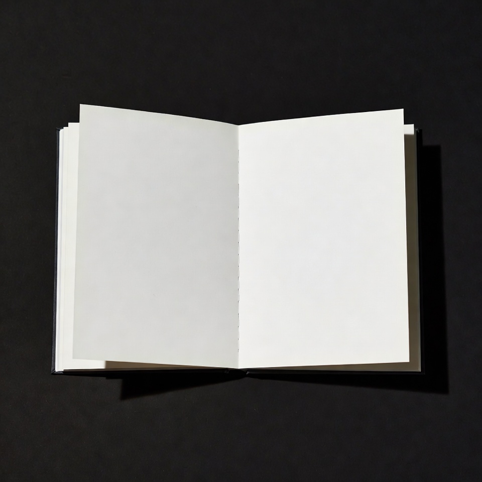 An open book with blank white pages is displayed flat on a solid black background. The book's cover is dark, and both interior pages are completely empty. It is photographed from directly above, highlighting the clean, empty spreads.