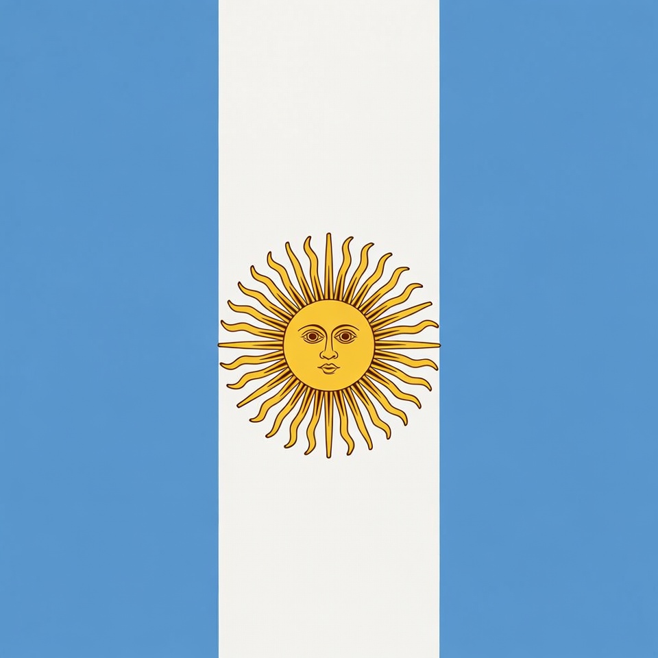 The flag of Argentina features three horizontal stripes in light blue, white, and light blue. Centered on the white stripe is the Sun of May, a golden sun with a face and 16 rays. The design is simple and iconic, isolated on a plain background.