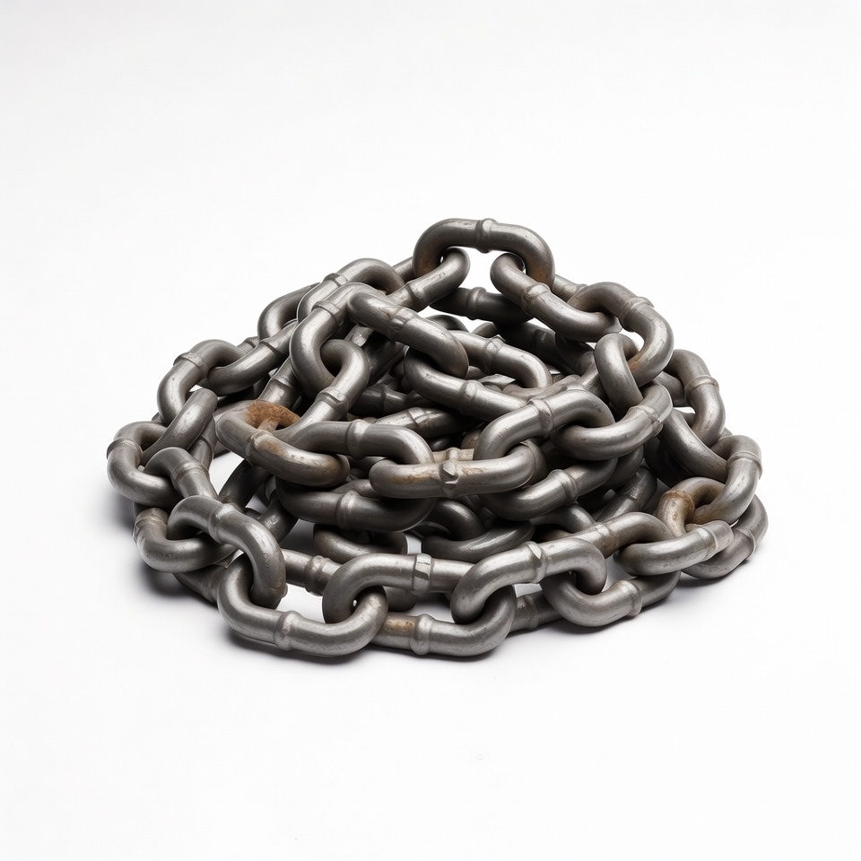A thick, heavy metal chain is coiled into a pile on a plain white background. The chain features large oval links with a slightly rusted, industrial appearance. It is isolated with no other objects visible.