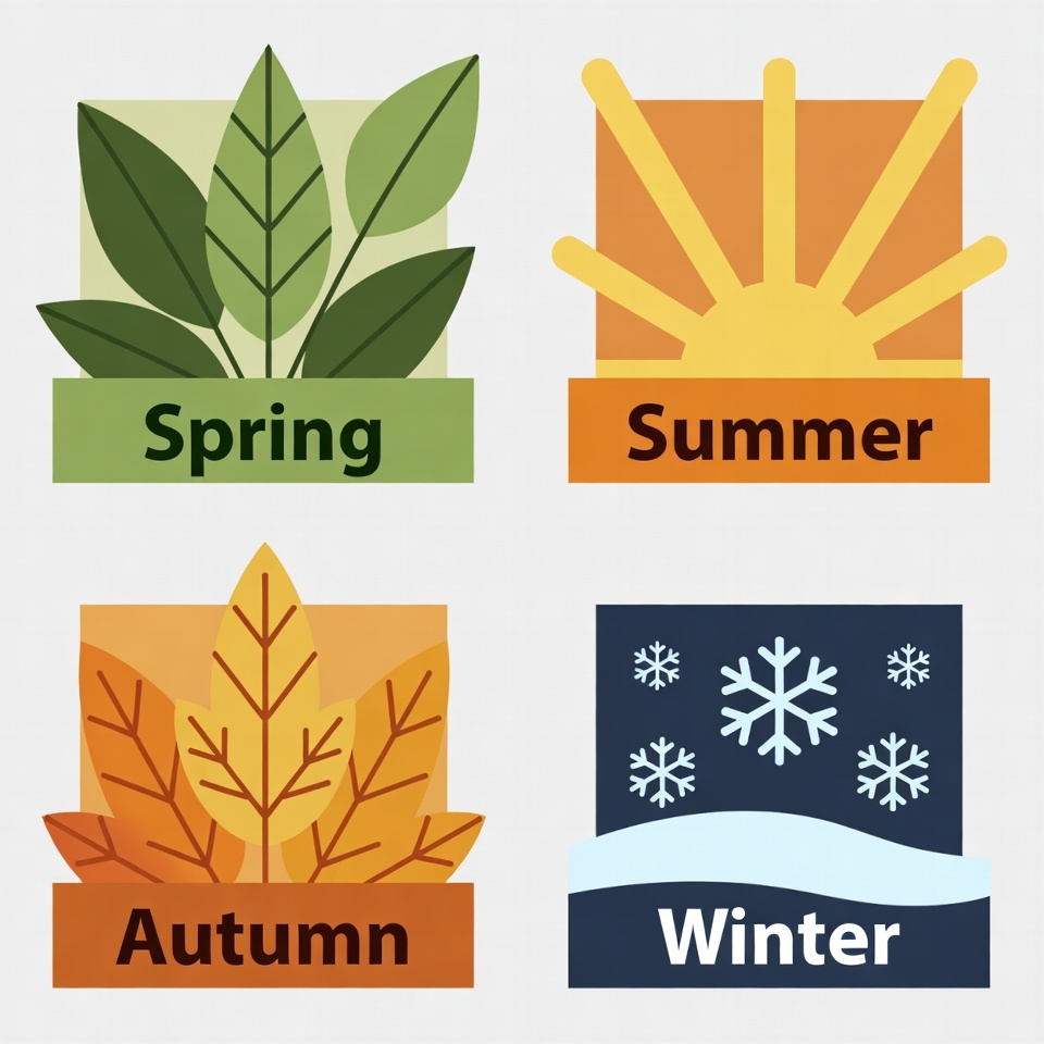 autumn, clipart, flat design, four seasons, green leaves, icons, illustration, isolated background, nature, orange leaves, snowflakes, spring, summer, symbols, weather, winter, yellow sun, seasons