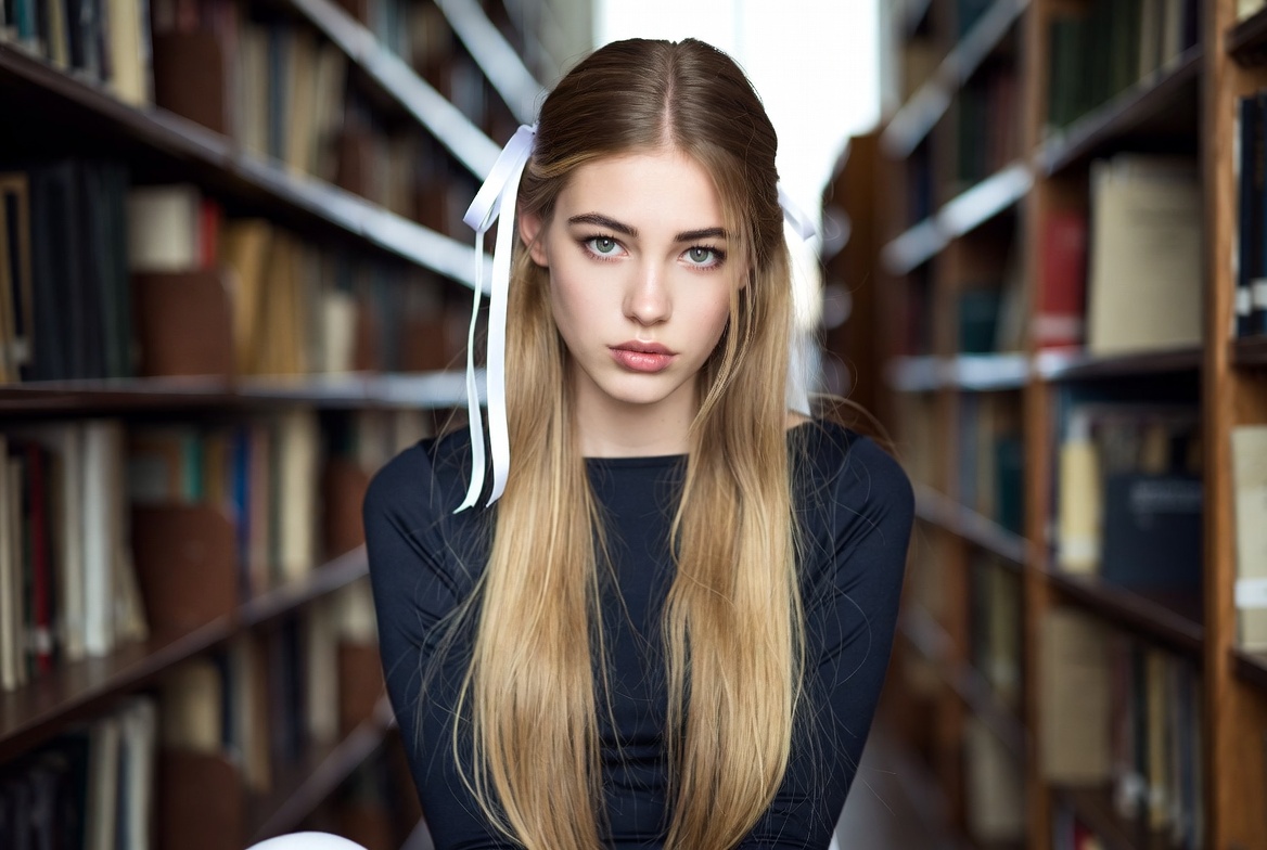 White, black top, blonde hair, bokeh background, books, books, bookshelves, female, hair bow, indoor, library, library interior, long hair, portrait, pout lips, reading room, white bow, woman, wooden shelves, young woman, girl