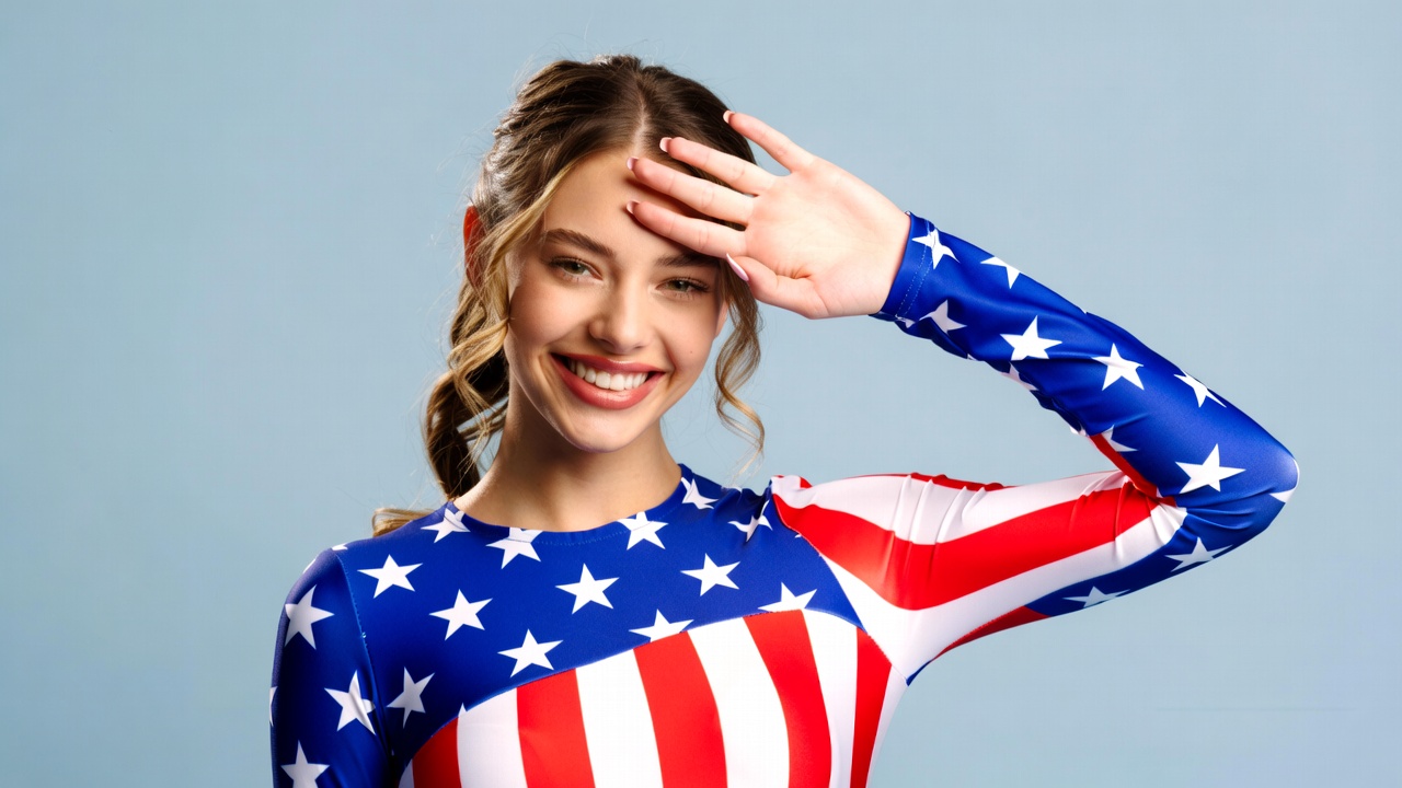 A young woman with wavy blonde hair smiles brightly while raising her hand in a waving gesture. She wears a form-fitting bodysuit patterned with red and white stripes and blue stars resembling the American flag. The image is set against a solid light blue background.