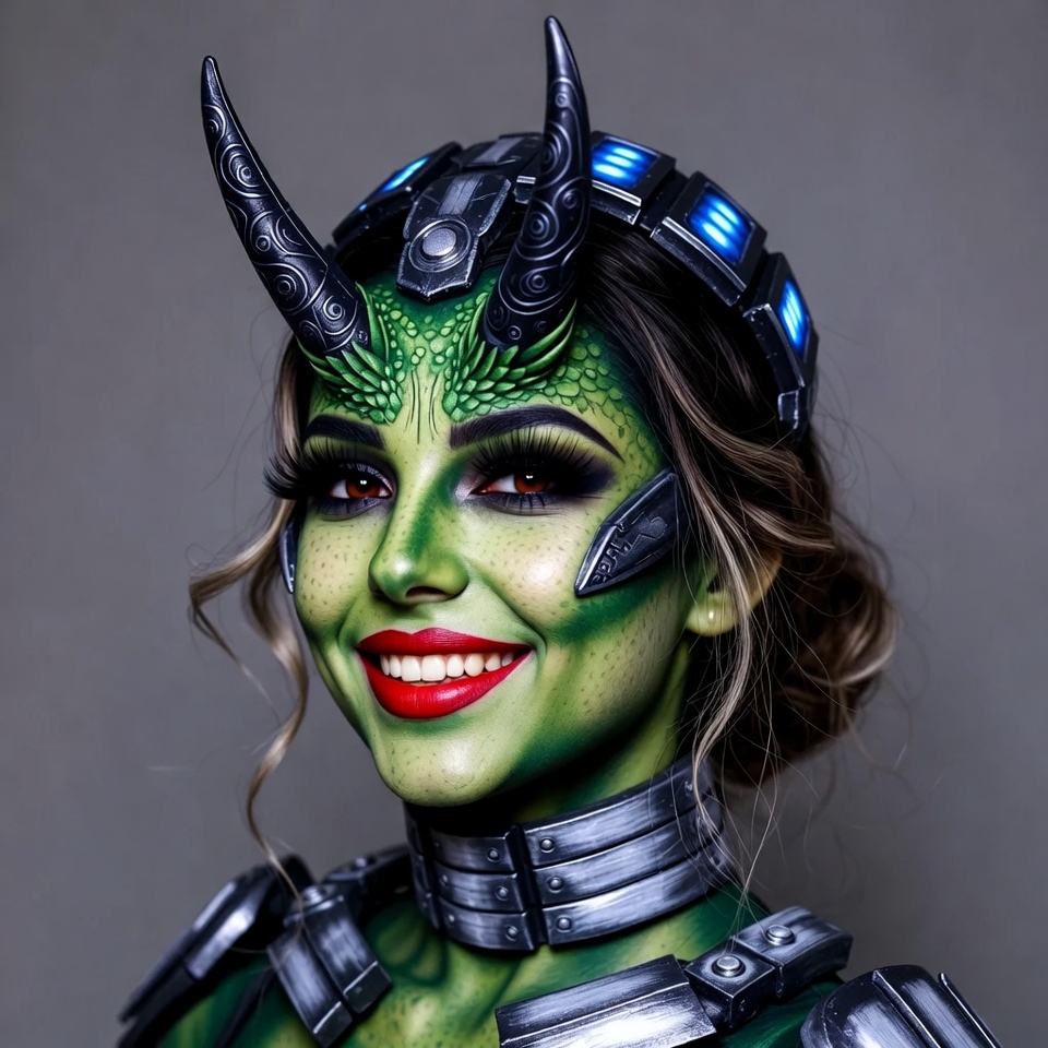 A woman with green alien demon face paint and horns smiles at the camera. She wears a futuristic headpiece with blue lights, metallic neck collar, and shoulder armor. Her brown hair is styled in loose waves, set against a plain gray background.