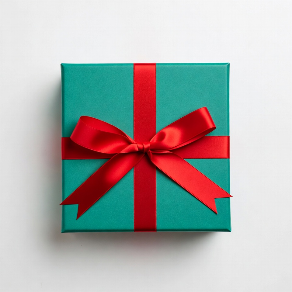 A teal gift box sits on a white background, topped with a large red satin ribbon tied into a bow. The ribbon crosses over the box and features long trailing ends. The box is viewed from directly above, emphasizing its square shape and festive wrapping.