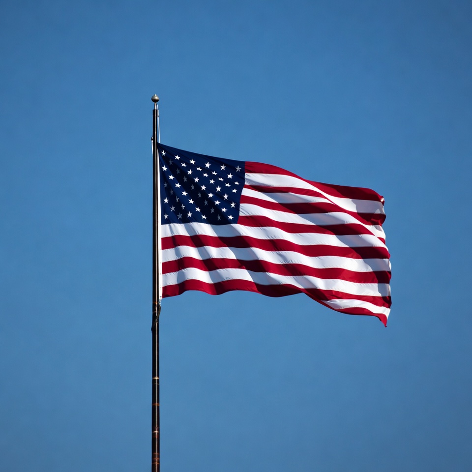 USA flag, blue sky, flag flying, flagpole, isolated background, national flag, patriotic symbol, red white blue, stars and stripes, waving flag, American flag