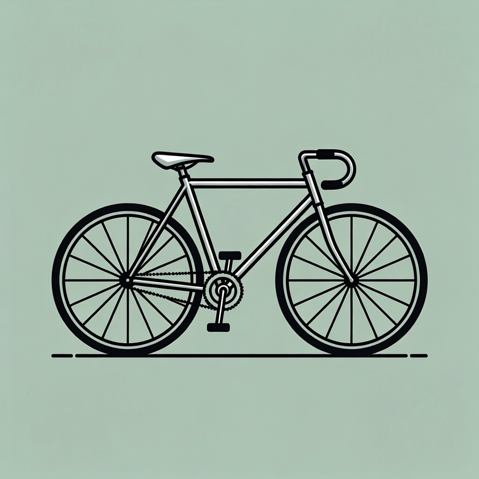 A minimalist line drawing of a road bicycle with drop handlebars and thin wheels is depicted on a light green background. The bike features a white saddle, chain drive, and sleek frame in black outlines. It stands isolated against the solid background.