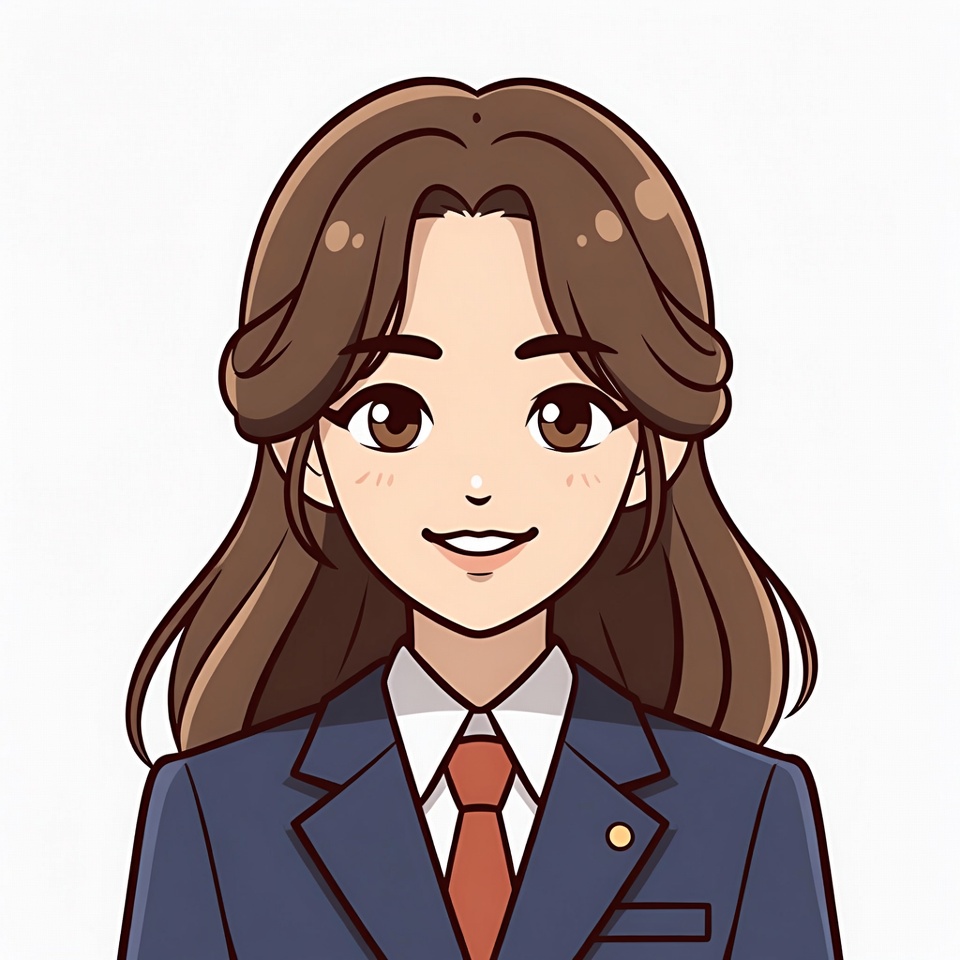 Asian, big eyes, brown hair, cartoon, cheerful expression, cute, female, illustration, isolated background, kawaii, long hair, manga style, navy blazer, portrait, red tie, school uniform, schoolgirl, smiling, white shirt, young woman, anime girl