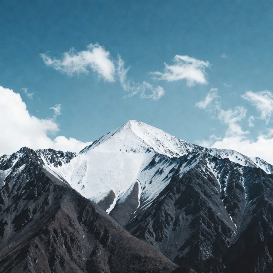A tall snow-capped mountain peak rises sharply against a clear blue sky dotted with white clouds. Surrounding ridges feature patches of snow and rocky terrain. The landscape appears rugged and isolated.