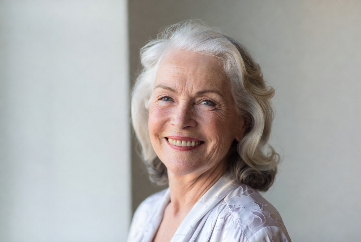 White woman, bright eyes, closeup face, female portrait, fine wrinkles, gray hair, happy expression, headshot, indoor portrait, light blouse, mature woman, portrait, senior portrait, senior woman, silky blouse, silver hair, smiling woman, woman face, woman smiling, elderly woman
