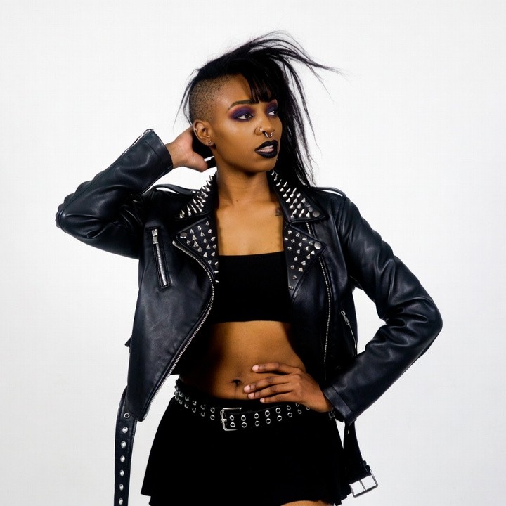A young African-American woman with an undercut hairstyle, purple eyeshadow, and a lip piercing poses confidently against a white background. She wears a black studded leather jacket unzipped over a black crop top, revealing her midriff and a belly tattoo. She pairs the outfit with a short black studded skirt and hand on hip.