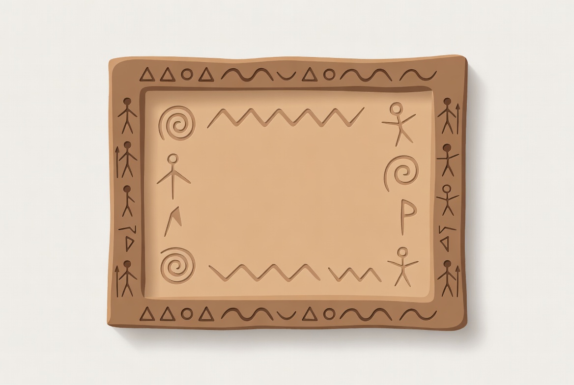 A beige rectangular frame features primitive cave art-style drawings including stick figures, spirals, triangles, and zigzag lines. The central area is a blank tan space. The artwork has an earthy, ancient aesthetic on an isolated white background.