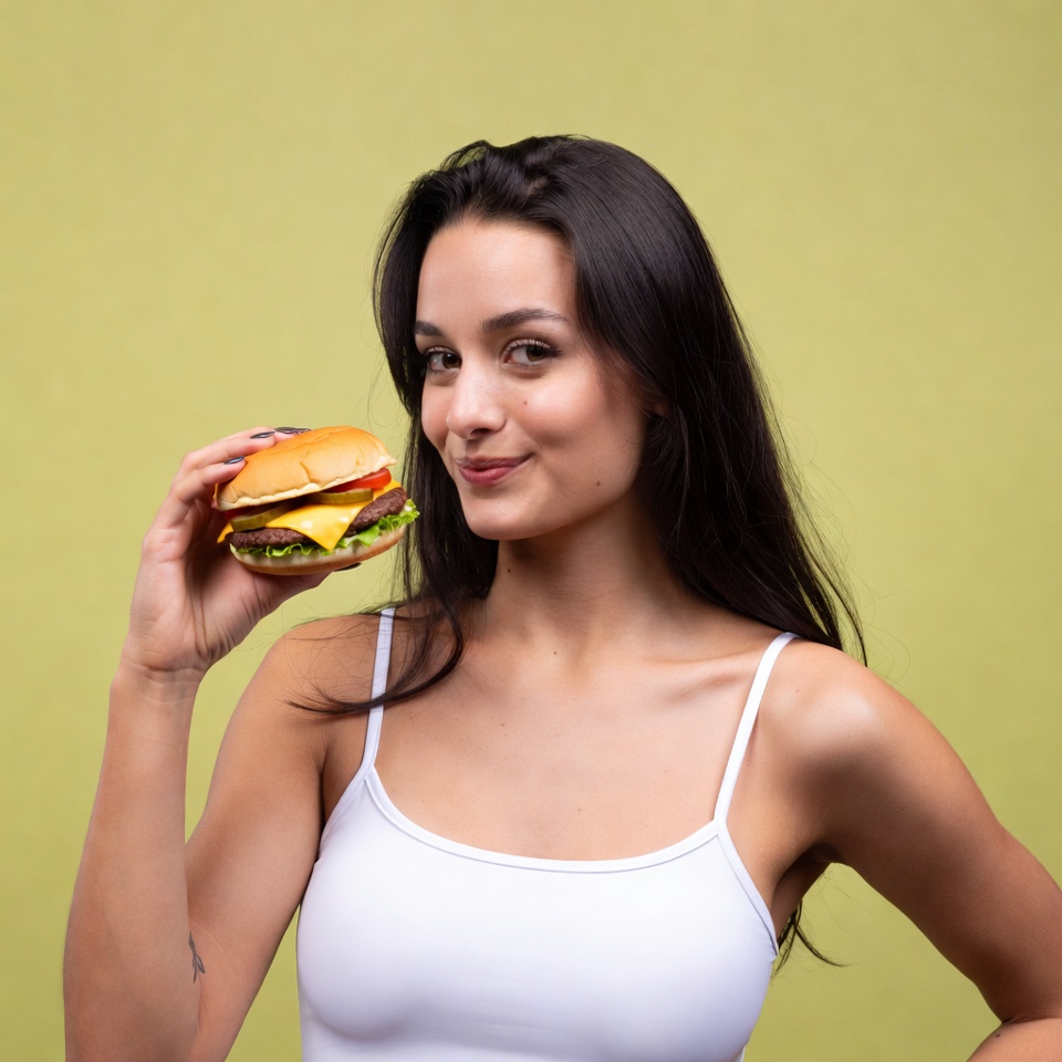A young woman with long dark hair holds a cheeseburger with lettuce and tomato in her hand. She wears a white tank top and stands against a light green background. She smiles playfully while posing with one hand on her hip.