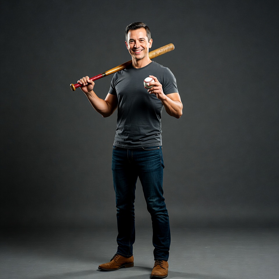 A smiling middle-aged man with short dark hair stands confidently on a gray background. He wears a gray t-shirt, blue jeans, and brown shoes while holding a wooden baseball bat over his shoulder with his right hand and a white baseball in his left hand. His muscular arms are visible as he poses for the camera.