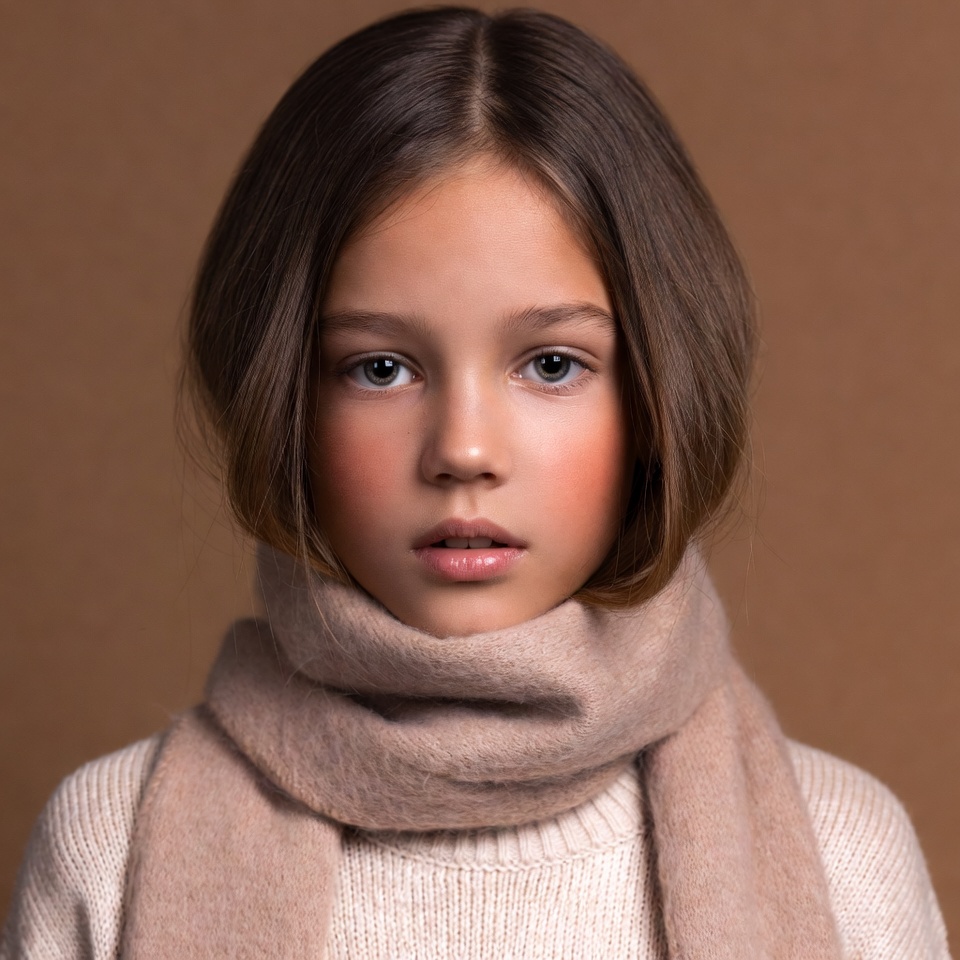 A young girl with long brown hair and green eyes gazes at the camera. She wears a light beige scarf wrapped around her neck and a matching sweater. The image features a plain brown background.
