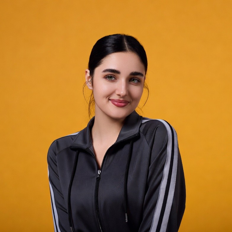 A young woman with dark hair in a bun smiles at the camera against a bright yellow background. She wears a black zip-up tracksuit with white stripes on the sleeves. Her green eyes and subtle makeup are highlighted in the close-up portrait.