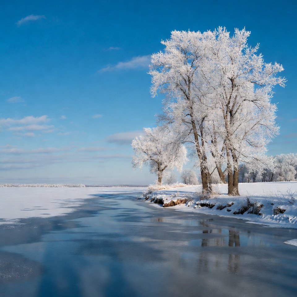 Several trees with branches covered in white frost stand along the edge of a frozen river under a clear blue sky. Snow blankets the ground and riverbanks, with the ice reflecting the sky and trees. Wispy clouds dot the bright winter horizon.