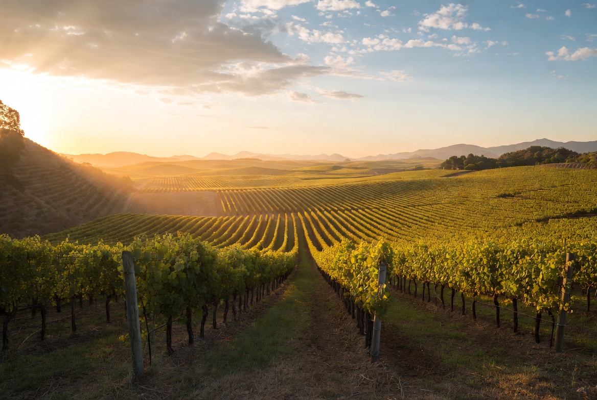 Expansive rows of grapevines stretch across rolling hills under a vibrant sunset sky. Golden sunlight illuminates the lush green vines and distant mountains. A pathway runs between the neatly aligned vineyard rows.