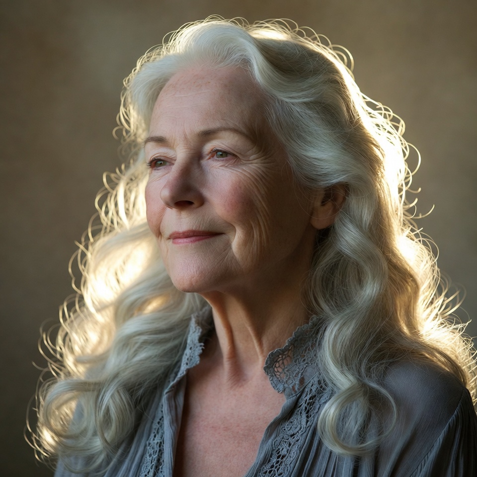 An elderly woman with long, wavy silver hair gazes slightly to the side. She wears a delicate lace-collared gray blouse and stands against a warm beige background. Soft lighting highlights her face and hair, creating a gentle glow.