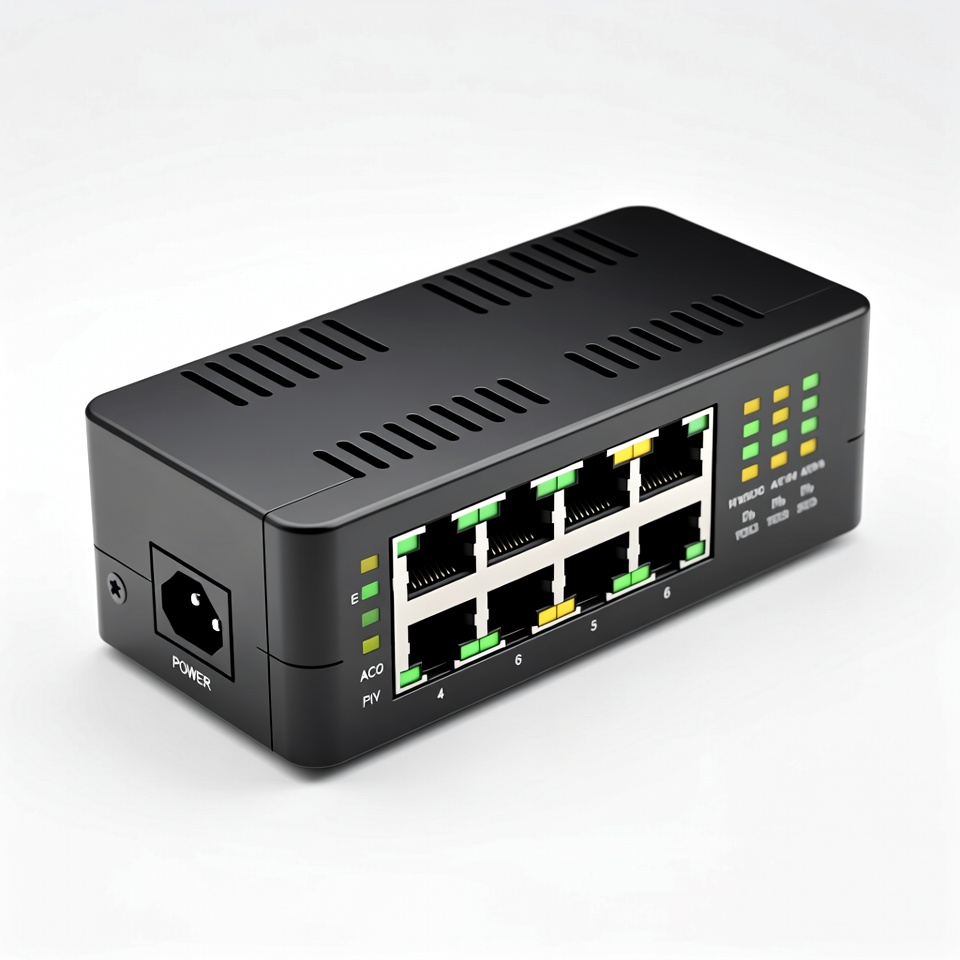 8-port switch, AC adapter, Ethernet switch, LED lights, PoE injector, black switch, gigabit switch, green LEDs, isolated background, network device, network switch, networking hardware, power input, rackmount, unmanaged switch, PoE switch