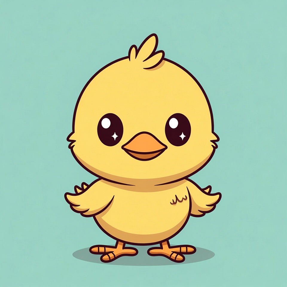 A kawaii-style cartoon yellow chick stands with wings spread on a light blue background. The chick has large sparkling eyes, a small orange beak, and orange feet. It features a fluffy tuft on its head and subtle shading for a 3D effect.