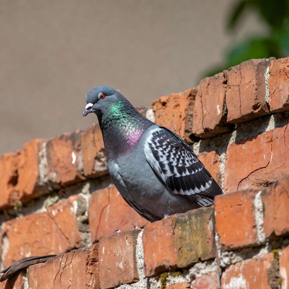 animals, bird, brick wall, gray pigeon, green feathers, iridescent neck, outdoor, perched bird, purple feathers, red bricks, red eye, rock pigeon, striped feathers, urban bird, wildlife, wings, pigeon